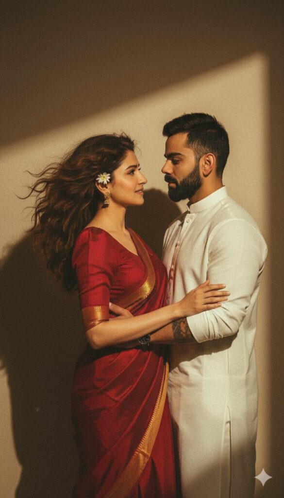 dramatic contrasts add mystery and artistry to the scene, creating a moody yet enchanting cinematic effect. Make the girl pose like she’s walking and looking back while the guy is holding her saree pallu very evidently and the guy should be looking at the girl.