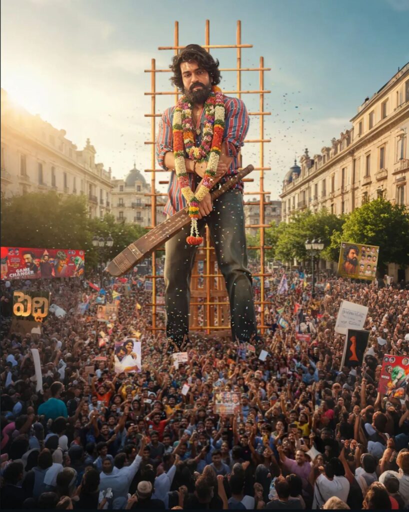 The cutout is decorated with a beautiful, vibrant flower garland draped gracefully around the neck and shoulders, adding a festive and respectful touch. Place the cutout on a sturdy support frame in a busy public square filled with a diverse crowd of enthusiastic fans facing and admiring it. Fans are cheering, holding flags, banners, and placards with the person’s image, some capturing the moment on their phones. The fans look up in awe, creating a natural, dynamic interaction.Add scattered fresh flower petals on the ground, colorful confetti floating gently in the air, and warm sunlight casting soft shadows over the scene. The environment should feel lively and celebratory, with realistic urban elements like theatre Name Sandhya 35MM and street lamps framing the background.”